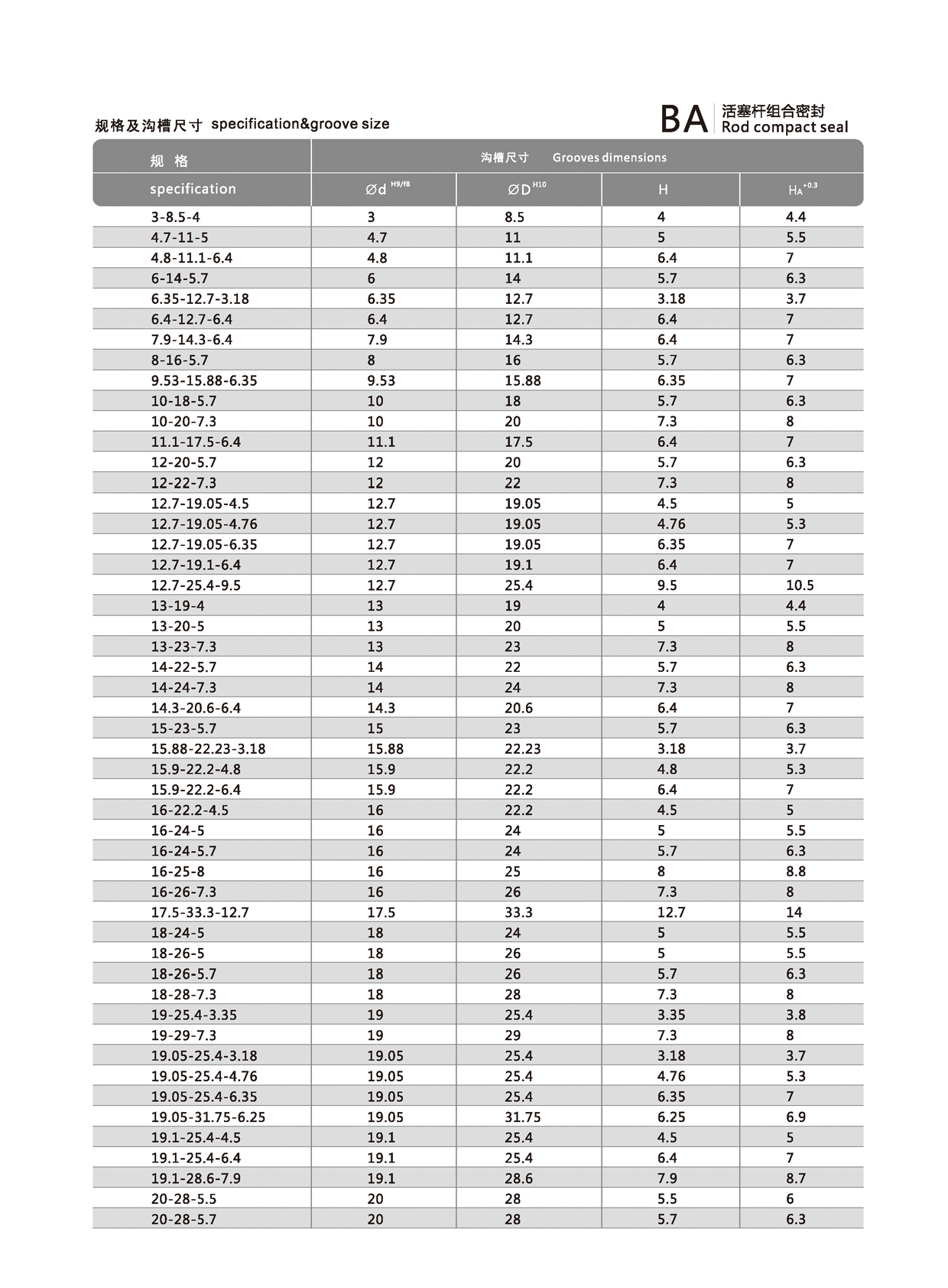 BA 是由一个唇形聚氨酯密封圈,沟槽内嵌一个O型圈组合而成,从而扩大了本产品的压力适用范围,使之在低压工况下的密封性能更加突出。